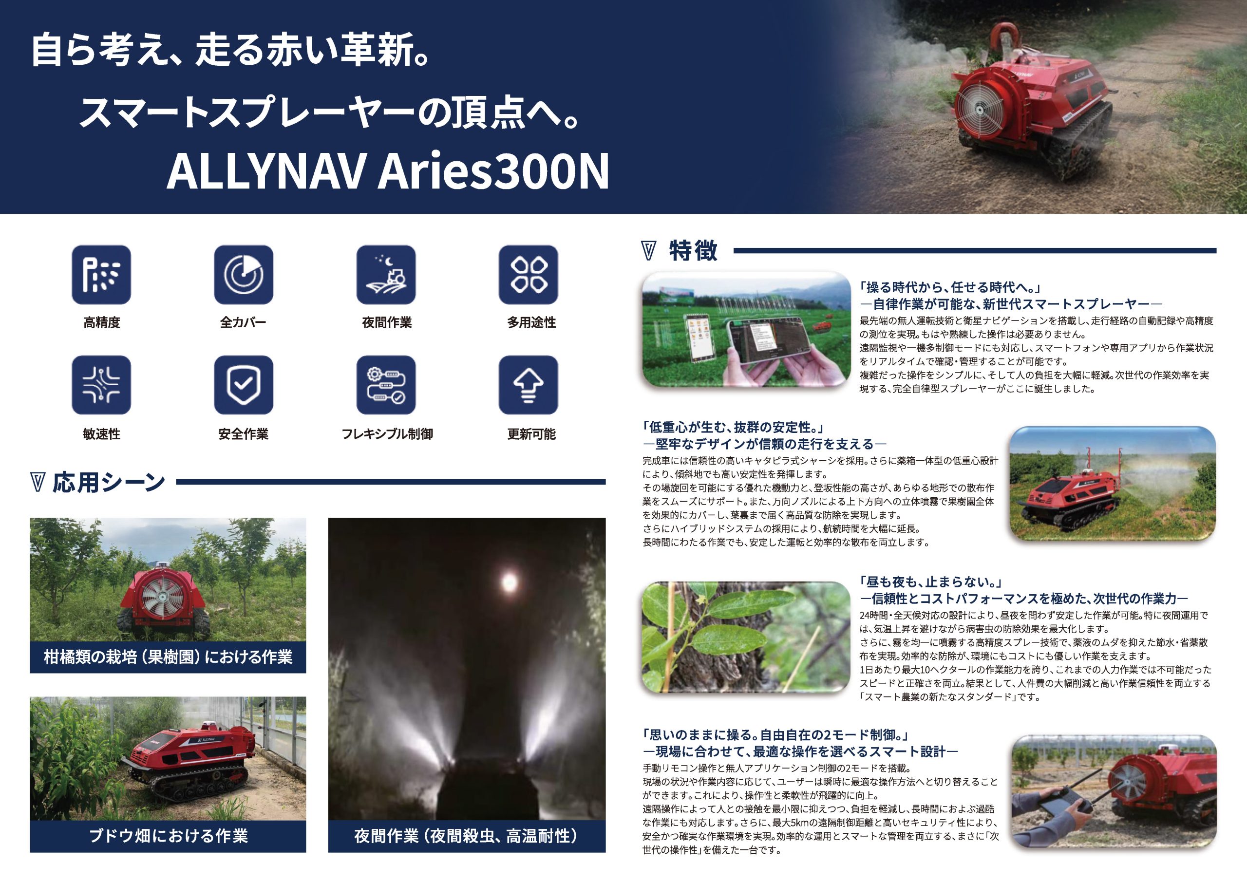 その場での旋回と長距離地への対応により、狭い果樹園や起伏のある果樹園でも作業を最適化し、病害防除と収穫量の向上を実現します。